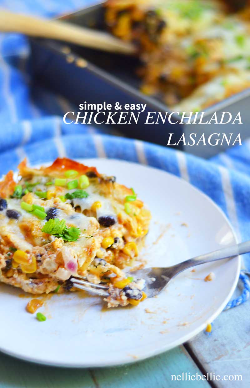 This chicken enchilada lasagna is quick and easy to put together with some simple shortcuts. A delicious meal your family will love!