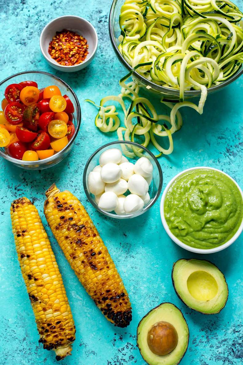 These Caprese Shrimp Zoodle Bowls with Avocado Sauce are a deliciously light and low carb dinner idea that's made up almost entirely of veggies!