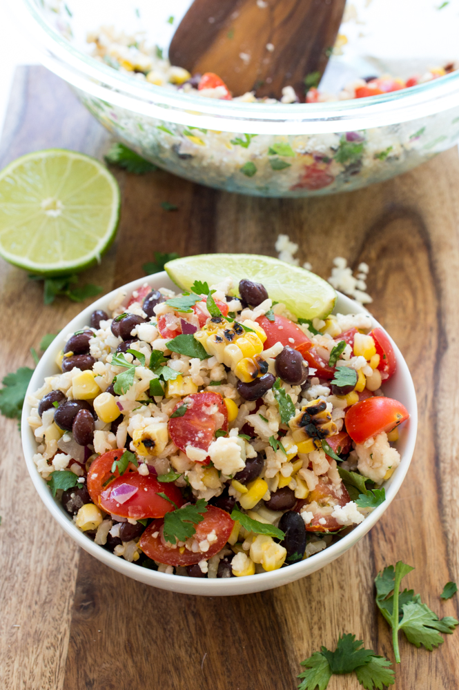 Grilled Corn and Black Bean Salad with Rice. A healthy summer side dish that takes less than 30 minutes to make! Loaded with tons of fresh vegetable! By chefsavvy.com