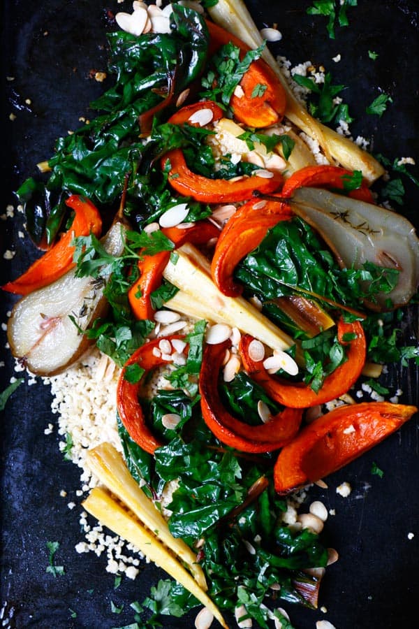Warm Autumn Salad Recipe. Wholesome plantbased warm salad with roasted Hokkaido squash, parsnips and pears tossed with millet and leafy chard.