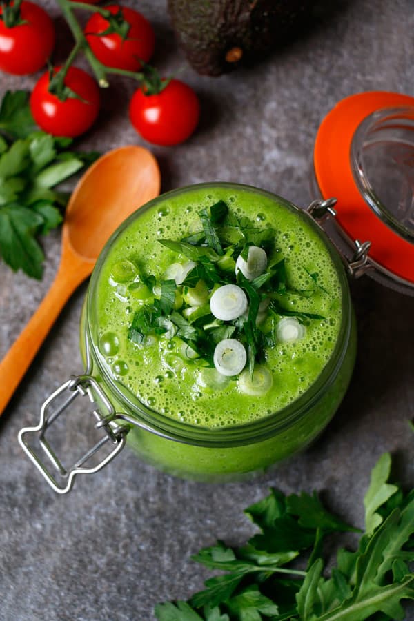 Chilled Green Summer Soup Recipe. Raw vegan creamy green soup with cucumber, rocket, parsley and avocado that is perfect for summer.