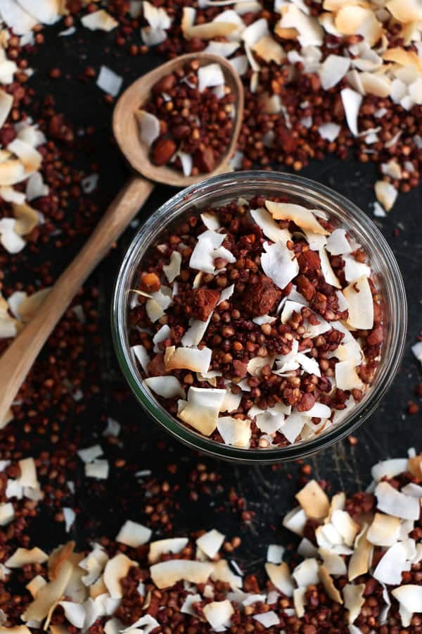 Raspberry, Coconut and Buckwheat Granola Recipe. Healthy gluten-free version of granola with buckwheat groats, almonds, raspberries and coconut.