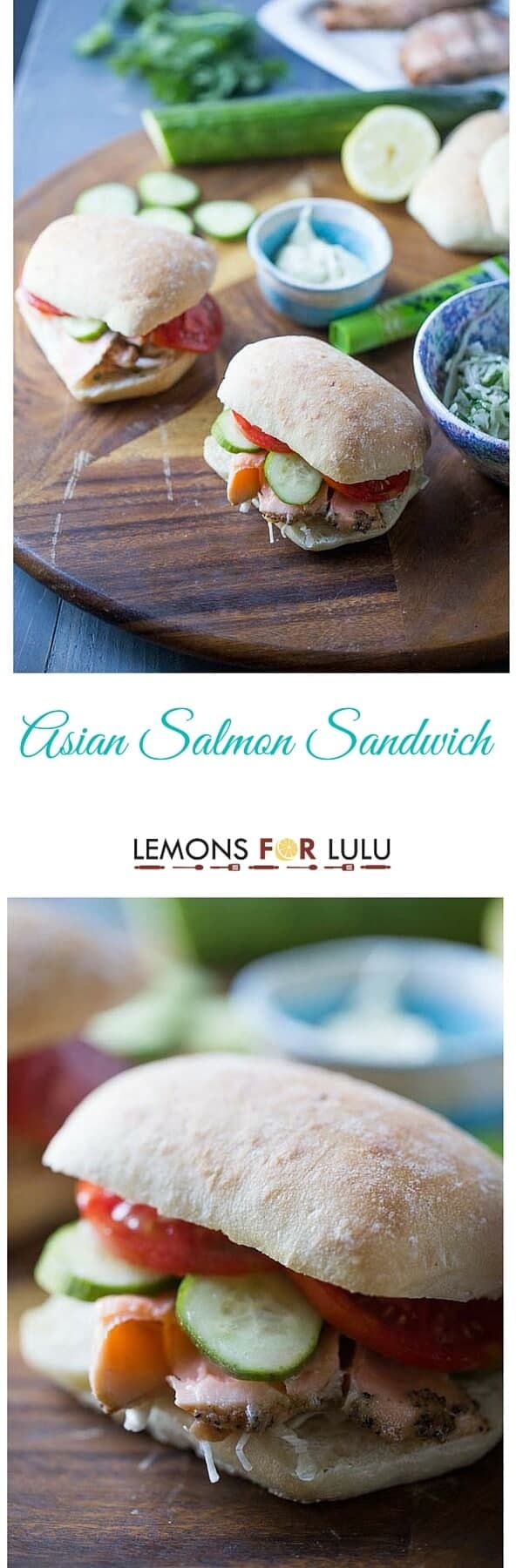 A flavorful Asian salmon sandwich with seasoned salmon, fresh vegetables and a spicy wasabi mayo!