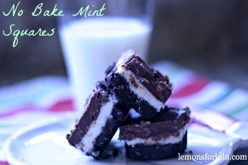 No bake mint squares have a cookie crust, creamy mint filling and mint flavored chocolate. Perfect for your cookie tray!