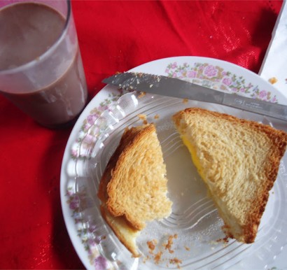 A whole egg baked in between 2 slices of bread—and cream cheese!